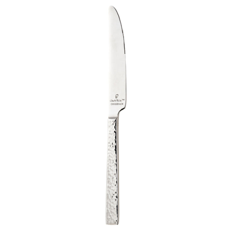 The 1880 Hospitality B327KDTF Oneida® Dinner Knife 9-1/2" is a meticulously crafted piece designed to enhance dining experiences across various hospitality settings. Constructed from 18/0 stainless steel, this dinner knife offers a balance of durability and aesthetic appeal, making it a preferred choice for both casual and upscale dining spaces. The knife features a distinctive hammered finish, part of the Chef's Table Hammered™ collection, which provides a tactile and visual contrast that adds elegance to any table setting. With a length of 9-1/2 inches, it is ergonomically designed for comfortable handling, suitable for restaurants, hotels, and catering services seeking to complement their tableware with high-quality cutlery. The 1880 Hospitality dinner knife is engineered to withstand the rigors of frequent use while maintaining its luster and performance, ensuring a long-lasting addition to any culinary establishment. Its design not only matches contemporary dining trends but also offers versatility for various dining occasions, making it a versatile tool in the arsenal of professional chefs and event planners. This knife is an optimal choice for those who value both functionality and style in their dining utensils.