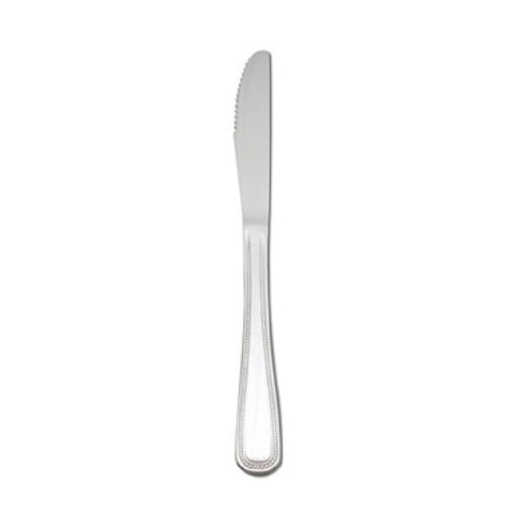 The 1880 Hospitality B595KPVF Oneida® Dinner Knife 8-3/4" 1-piece is a sophisticated addition to any dining experience, designed to meet the needs of both formal dining settings and everyday use. With its elegant rounded handle and a beaded border, this knife exudes a timeless appeal suitable for various hospitality sectors, from upscale restaurants to casual dining establishments. Crafted from high-quality 18/0 stainless steel, the knife combines durability with a sleek finish, ensuring long-lasting use without compromising on style. The single-piece construction enhances its sturdiness, making it a reliable choice for high-volume environments such as hotels and banquet halls. Measuring 8-3/4 inches in length, it offers a comfortable grip and balanced handling for seamless dining experiences. The Delco® Prima collection, known for its refined design and excellent craftsmanship, includes this knife as part of its esteemed lineup, providing a touch of elegance and functionality to any table setting. This dinner knife not only meets the aesthetic standards expected in the hospitality industry but also stands out for its technical specifications that ensure both durability and style, making it an ideal choice for operators looking to elevate their dining ambiance.