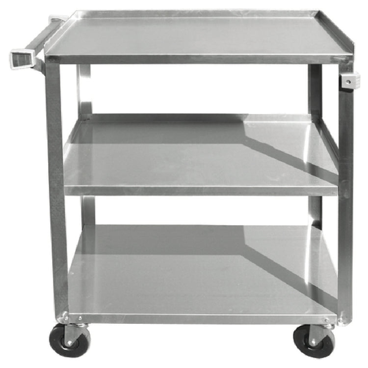 The 1880 Hospitality BC-2415SS Update International™ Bus Cart is a versatile and robust solution designed for diverse operational environments requiring reliable transport of items up to 300 lb. capacity. This stainless steel bus cart features a 3-tier structure with overall dimensions of 27-1/2 inches in length, 16-1/4 inches in width, and 32-1/8 inches in height, making it a compact yet spacious tool for efficient service. Equipped with bumper guards on the handle and corners, it ensures added safety and durability, protecting against accidental bumps and collisions. The inclusion of 4-inch diameter swivel casters, two of which are lockable, provides exceptional maneuverability and stability, allowing the cart to be easily navigated through tight spaces while also securing it in place when needed. This bus cart is ideal for a variety of settings including hospitality venues, restaurants, and catering events where streamlined service and robust construction are paramount. Its stainless steel build not only enhances durability and longevity but also assures compliance with high hygiene standards, catering to the demanding needs of professional environments. The BC-2415SS stands out as a functional and reliable choice for industry professionals seeking an efficient and durable transport solution.