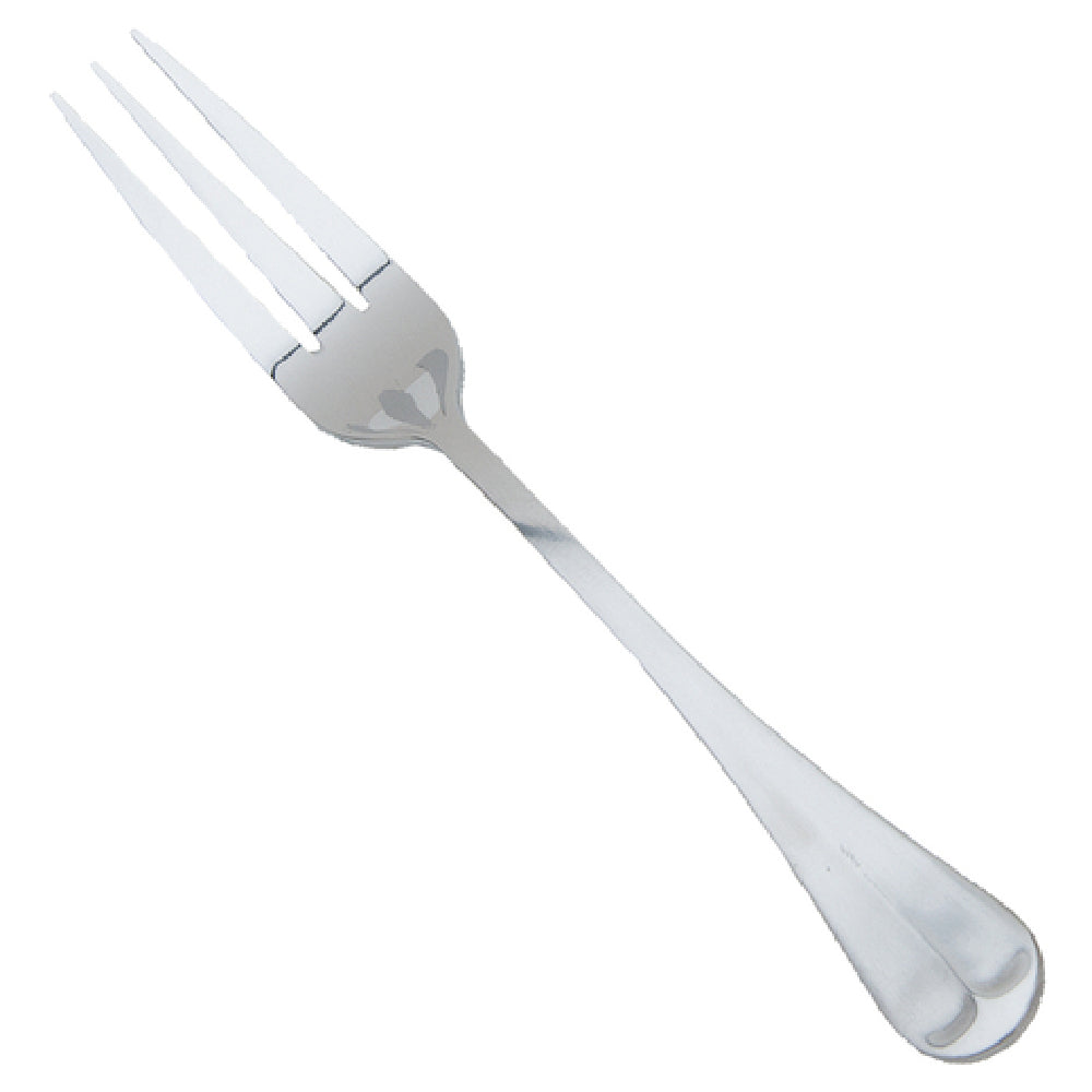 The 1880 Hospitality CH-95H Update International™ Dinner Fork 7-15/16" 3 Tine is a meticulously crafted utensil, embodying both functionality and style. This dinner fork, measuring precisely 7-15/16 inches, features three tines, making it not only an elegant addition to any table setting but also highly practical for a variety of dining experiences. Constructed from heavy-weight 18/0 stainless steel, it ensures long-lasting durability and reliability in both commercial and residential settings. The satin finish enhances its aesthetic appeal, giving it a refined, modern look that complements any dining ambiance. Part of the Chelsea collection, this fork is designed to meet the rigorous standards of the hospitality industry, making it an ideal choice for restaurants, hotels, and catering services seeking high-quality cutlery that combines elegance with robust performance. Its construction from 18/0 stainless steel provides excellent resistance to staining and corrosion, ensuring that it maintains its pristine appearance over time, even with frequent use. This product's unique value lies in its blend of practicality, durability, and design sophistication, making it suitable for both formal dining occasions and everyday use, appealing to a diverse market segment within the food service industry.