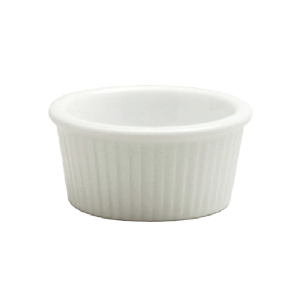 The 1880 Hospitality F8010000612 Oneida® Ramekin 2-1/2 Oz. 2-1/2" Dia. is a versatile and essential piece for any professional or home kitchen, offering a practical solution for serving and presenting a variety of dishes. This ramekin features a 2-1/2 ounce capacity and a 2-1/2 inch diameter, making it ideal for portion control and individual servings. The round design with fluted sides adds an elegant touch to table settings, catering to a range of dining environments from casual to fine dining. Crafted from bright white porcelain, this ramekin offers a scratch-resistant glaze that ensures longevity and maintains its pristine appearance over time. Its rolled edge design contributes to its durability, while being microwave and dishwasher safe adds convenience and ease of use. The ramekin is part of the Buffalo White Ware collection, recognized for its quality and reliability. Furthermore, it comes with a 1-year no-chip warranty, providing assurance of its durability. This makes it a valuable addition to hospitality sectors, commercial dining establishments, and home kitchens alike, delivering both functionality and aesthetic appeal to enhance the dining experience.