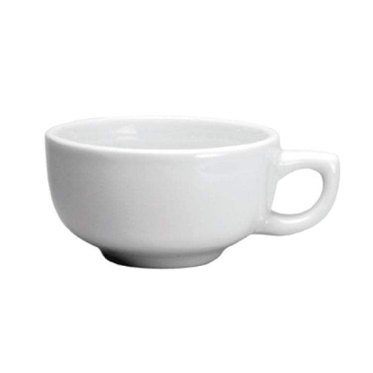 The 1880 Hospitality F9010000524 Oneida® Jumbo Cup 14 Oz. - 4-5/8" is a meticulously crafted porcelain cup that seamlessly combines functionality and durability, making it a standout choice for various market segments in the hospitality industry. With its generous 14-ounce capacity and dimensions of 4-5/8 inches, this jumbo cup is designed to accommodate larger servings, catering to the needs of coffee shops, restaurants, and hotels aiming to provide enhanced customer experiences. The cream white porcelain construction not only adds an elegant aesthetic appeal but also ensures resilience, being scratch and mark resistant, which is crucial for high-traffic environments. Its microwave and dishwasher safe features offer convenience and efficiency in fast-paced settings, reducing downtime for staff and enhancing operational workflow. The inclusion of a one-year no-chip warranty further underscores the product's commitment to longevity and reliability. Manufactured by Buffalo under the White Ware category, this cup embodies quality and timeless design, making it an indispensable asset for establishments prioritizing both practicality and style in their service offerings.