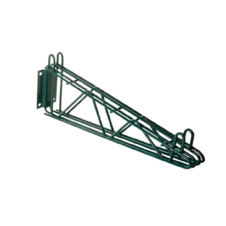 The 1880 Hospitality FWB24DGN Focus Foodservice Direct Mount Wall Bracket for Wire Shelving is a meticulously designed solution for optimizing storage in both wet and dry environments. With a depth of 24 inches, this double bracket is crafted with all-welded construction, ensuring exceptional durability and stability. The green epoxy finish not only provides an appealing aesthetic but also enhances resistance against corrosion and moisture, making it suitable for varied storage needs. This bracket is particularly beneficial for industries that require organized storage solutions, such as food service and hospitality. Its direct mount capability allows for seamless integration into existing setups, although it's important to note that mounting hardware is not included. The 1880 Hospitality FWB24DGN bracket meets NSF standards, which confirms its compliance with public health and safety requirements, making it a reliable choice for professional kitchens. The emphasis on robust construction and functional design underscores its utility as a valuable asset in any commercial or industrial setting. This product's strength lies in its ability to support wire shelving securely, ensuring efficient space management and organization tailored to the specific demands of the sector.