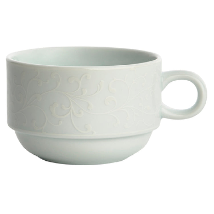The 1880 Hospitality L5803050510 Oneida® Breakfast Cup 6 Oz. 3-1/4" Dia. is a meticulously crafted piece designed for both functionality and elegance. This breakfast cup, fitting model L58030501, stands out with its capacity of 6 ounces and a precise diameter of 3-1/4 inches. Its stackable nature ensures space efficiency, making it an ideal choice for bustling dining establishments where storage optimization is key. The breakfast cup features a convenient handle for ease of use, while its embossed paisley design adds a touch of sophistication, appealing to both casual and fine dining environments. Made from high-quality porcelain, its bright white finish by Luzerne exudes a classic charm that complements any table setting. The Ivy Flourish design element further enhances its aesthetic appeal, making it suitable for upscale hospitality settings. As a glazed item, it promises durability and a lasting shine, ensuring it withstands the rigors of daily use in restaurants, hotels, and cafes. Please note that this is a special order item, and interested parties are encouraged to contact for more details, making it a unique addition for establishments seeking distinctive and high-quality tableware solutions.