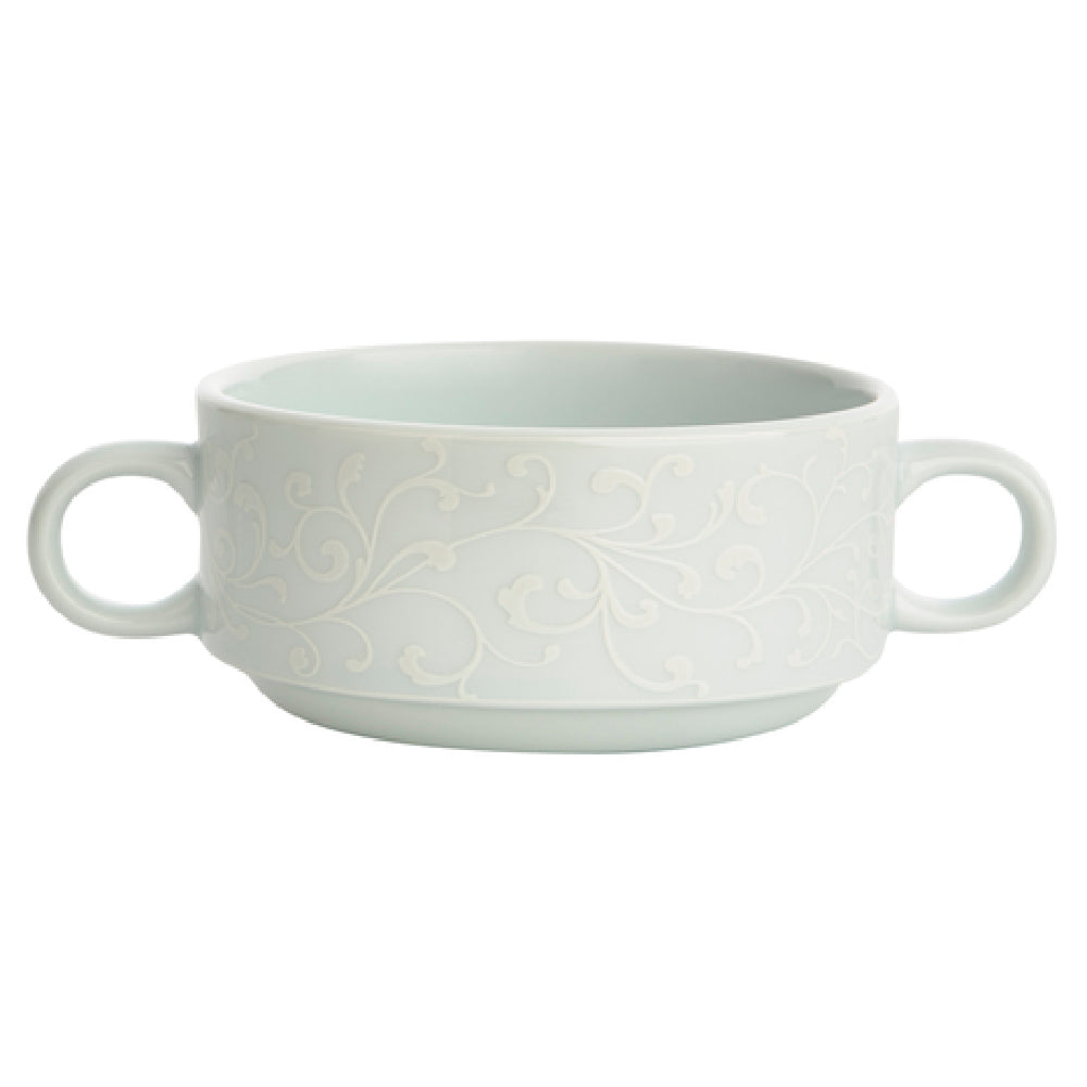 The 1880 Hospitality L5803050571B Oneida® Bouillon 9-1/2 Oz. 6" is a uniquely designed piece, catering to various segments within the hospitality industry with its distinct features and technical specifications. This elegant bouillon bowl, with a capacity of 9-1/2 ounces and a diameter of 6 inches, is crafted from bright white porcelain, ensuring both durability and a sophisticated appearance. Its round, stackable structure is complemented by two handles, offering ease of use and efficient storage solutions for busy dining environments. The bowl's embossed paisley design and glazed finish add a touch of refinement, making it suitable for upscale restaurants and catering services. Moreover, this porcelain piece is part of the Luzerne Ivy Flourish collection and is specifically designed to fit the L5803050500 model, ensuring compatibility and cohesive presentation with other tableware items. As a special order item, potential buyers are encouraged to contact for more details, highlighting its exclusive nature within the market. Such intricate design and functionality make the Oneida® Bouillon bowl a valuable asset for establishments aiming to enhance their dining experience with aesthetically pleasing and practical serveware options.