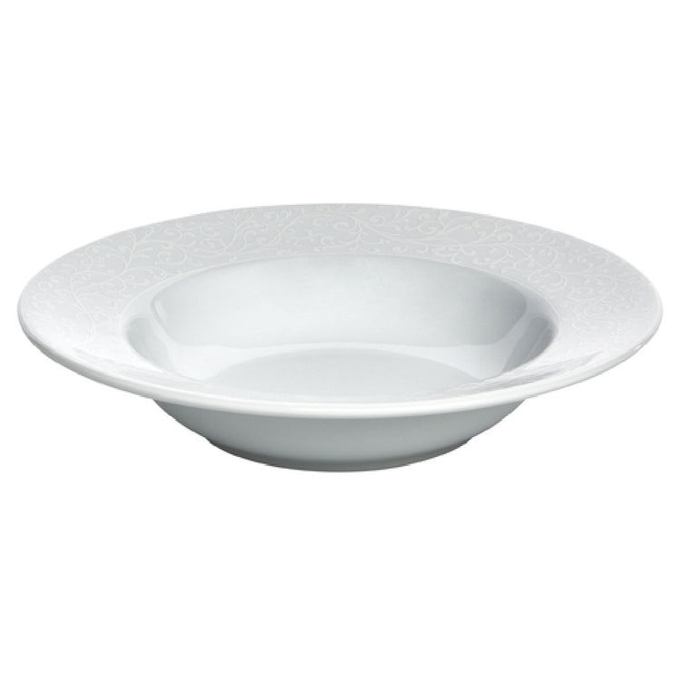 The 1880 Hospitality L5803050740 Oneida® Soup Bowl is a meticulously crafted piece, perfect for various dining settings, from upscale restaurants to catering events. This soup bowl boasts a capacity of 9-1/2 oz., making it ideally suited for serving appetizers or small portions of soup. With an 8-3/4" diameter, it provides ample space for creatively presenting dishes while maintaining a manageable size for table settings. Its round shape is enhanced by a wide rim, adding elegance and functionality by helping to prevent spills. The embossed paisley design offers a touch of sophistication, distinguishing it within the porcelain dining ware category. This bowl is glazed, ensuring a bright white finish that complements any tabletop ambiance. Made in Luzerne, the Ivy Flourish pattern adds a classic aesthetic appeal. As a special order item, it is tailored to meet specific requirements, offering exclusivity and customization potential. The combination of its technical features and aesthetic design makes the Oneida® Soup Bowl a versatile asset for hospitality venues seeking to elevate their dining experience with distinctive tableware.