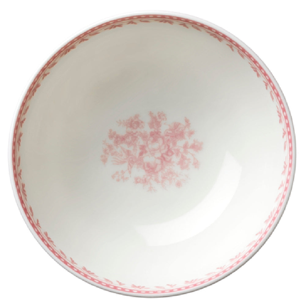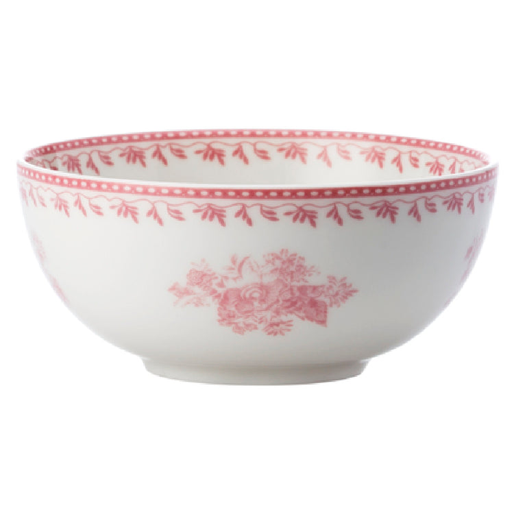 The 1880 Hospitality L6703052730 Oneida® Bowl 7 Oz. 4-1/4" Dia. is a distinctively designed piece made from high-quality porcelain, ideal for a variety of hospitality settings. This bowl features a 7-ounce capacity and a 4-1/4 inch diameter, making it perfect for serving smaller portions with style and elegance. Its irregular round shape adds a touch of uniqueness to any table setting, breaking away from traditional forms to inspire creativity in presentation. The bowl showcases a pink floral design set against a warm white background, a design choice that brings a sense of warmth and charm to dining experiences. The piece is glazed, ensuring a smooth and durable finish that both protects the intricate design and makes it easy to clean. Part of the Luzerne, Lancaster Garden collection, this bowl is not just a functional item but a piece of art that resonates with the hospitality industry's demand for both aesthetics and practicality. Its elegant yet robust build makes it suitable for upscale restaurants, catering services, and hotels seeking to enhance their dining presentations with a touch of refined elegance.