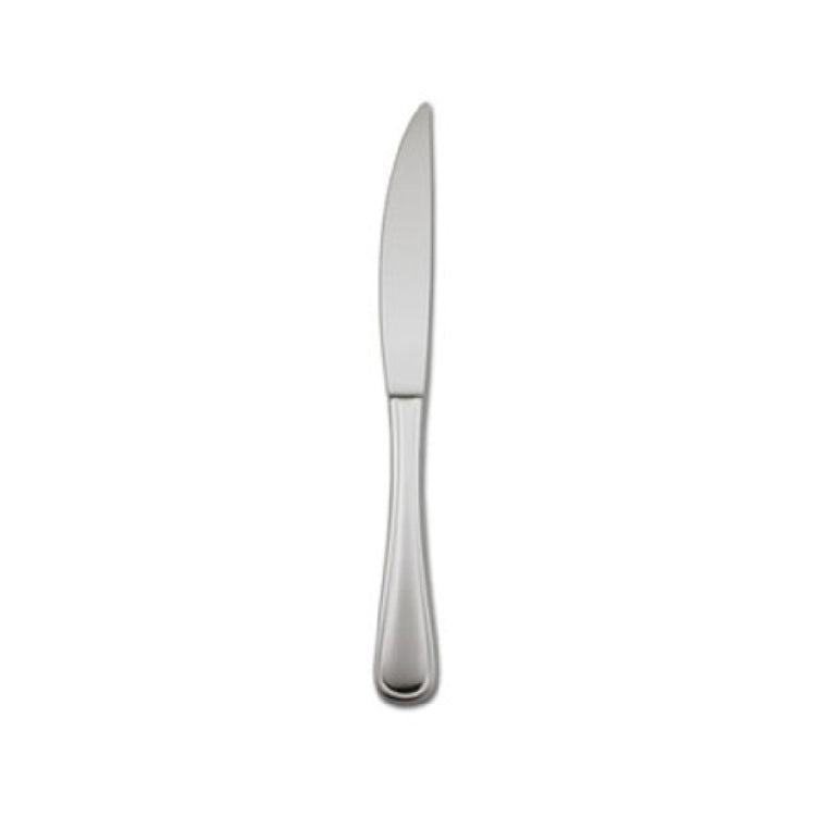 The 1880 Hospitality T015KSSF Oneida® Steak Knife 9-1/4" 1-piece is a meticulously crafted utensil that stands out in its class, designed for both functionality and elegance. Measuring 9-1/4 inches, this steak knife is precisely engineered as a single piece, enhancing its durability and structural integrity. The design features a curved border along the handle, adding an element of sophistication and ensuring a comfortable grip, ideal for various dining settings, from casual to fine dining establishments. Made from 18/10 stainless steel, the knife boasts an optimal balance of strength and corrosion resistance, guaranteeing a lasting shine and edge retention, which is crucial for frequent use in hospitality environments. The "New Rim" design element adds a contemporary touch, making it a versatile choice for modern table settings. This knife is suitable for restaurants, hotels, and catering services that value both performance and aesthetic appeal in their tableware. Its robust construction and superior materials make it a preferred option for professionals seeking reliability and style in their cutlery, ensuring an enhanced dining experience for guests across different market segments within the hospitality industry.