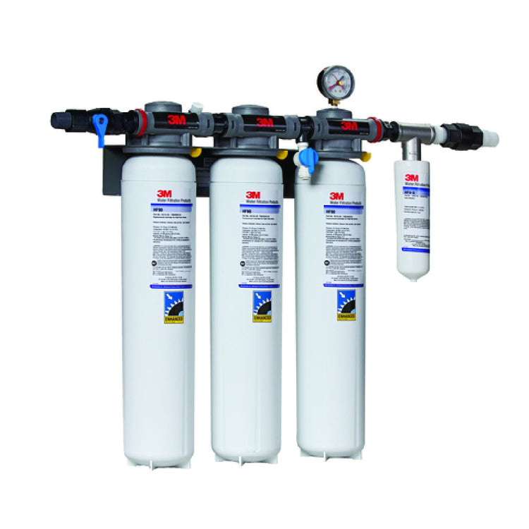 The 3M DP390 (5624102) 3M™ Water Filtration Products Dual Port Water Filtration System is a highly efficient solution for diverse water filtration needs, offering a flow rate of 15.0 gallons per minute and a filtration precision of 0.2 microns. This system is engineered to handle up to 162,000 gallons, making it suitable for both commercial and residential applications where high capacity and reliability are paramount. It comes equipped with a built-in pressure gauge and an outlet check valve, enhancing operational efficiency and user convenience. Mounting brackets facilitate easy installation, while its three cartridge filters and an additional scale inhibition cartridge ensure comprehensive filtration. This dual port system effectively reduces bacteria, sediment, chlorine taste and odor, and cysts, ensuring water is clean and safe for various applications. The 3M DP390 system is NSF certified, affirming its compliance with rigorous safety and quality standards. Ideal for food service establishments, healthcare facilities, and office buildings, this filtration system offers a robust and trustworthy solution for maintaining high water quality, thereby supporting diverse industry applications with its superior filtration capabilities.