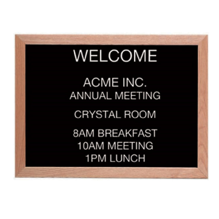 The Aarco AOFD1824L Message Center Board is a versatile communication tool measuring 24"W x 18"H, designed to meet the needs of various market segments, including educational institutions, corporate offices, and community centers. The open-face design ensures easy accessibility and visibility, making it an ideal choice for high-traffic areas. The board features a black felt panel, providing a classic backdrop for messages, announcements, or notices. Encased in a durable oak frame, the Aarco AOFD1824L combines aesthetics with functionality, ensuring longevity and stability in diverse environments. A distinct feature of this message center is the inclusion of a set of 3/4" Helvetica letters, which aids in creating neat, legible messages that quickly capture attention. Additionally, an assortment tray is provided, ensuring that the letters are organized and within easy reach, facilitating quick updates. This message center board is a practical and efficient solution for any setting requiring clear, organized communication. Its combination of design, materials, and accessories positions it as a valuable asset for conveying information effectively.