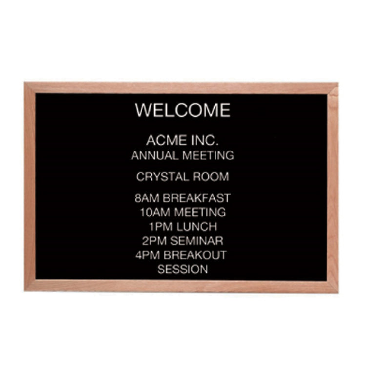 The Aarco AOFD2436L Message Center Board 36"W X 24"H Open Face is a meticulously designed communication tool that stands out for its simplicity and practicality in both professional and educational settings. With dimensions of 36 inches in width and 24 inches in height, this message center board maximizes display space while maintaining a manageable size for various environments. The open face design allows for quick and easy access, streamlining the process of updating information. Featuring a black felt panel, it provides a refined backdrop that enhances the visibility of messages and announcements. The oak frame not only adds a touch of elegance but also ensures durability and stability. A key feature of this product is the inclusion of a set of 3/4" Helvetica letters, which come with an assortment tray, offering users a customizable and organized way to communicate effectively. This message center board is ideal for businesses, schools, and community centers seeking a reliable and aesthetically pleasing method to convey messages, announcements, and schedules. Its classic design and practical features make the Aarco AOFD2436L a valuable addition to any environment where clear and consistent communication is essential.