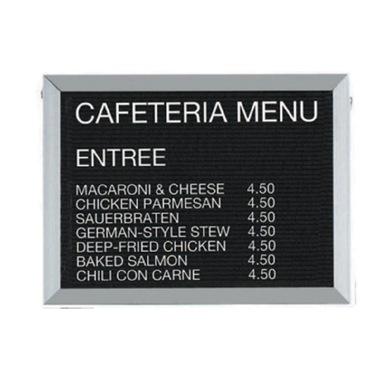 The Aarco BOFD1824L Message Center Board is a versatile communication tool measuring 24 inches in width and 18 inches in height, designed to meet various informational display needs across different industries. It features an open face with a black felt panel, providing a classic and professional backdrop for messages and announcements. The board is framed with durable aluminum, ensuring longevity and a sleek aesthetic. A key component of this product is its included set of 3/4-inch Helvetica letters, which, in combination with the aluminum-framed structure, facilitates clear and effective messaging. Additionally, an assortment tray is provided, offering organized storage and easy access to letters, enhancing the usability and efficiency of the board. This product is ideal for businesses, educational institutions, and community centers that require a reliable and visually appealing method to convey information. Its straightforward design and functional features make it a practical solution for regularly updated content, announcements, or directional signage, ensuring that crucial information is always prominently and professionally displayed.