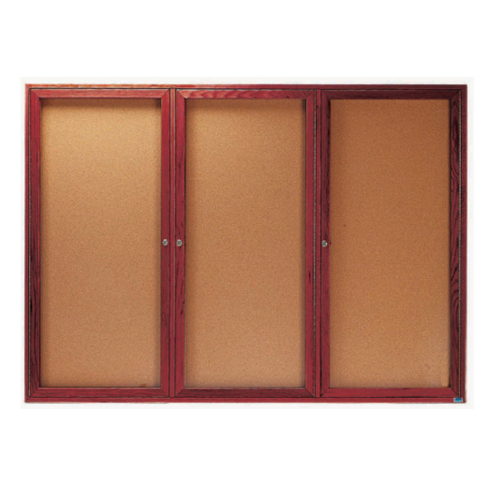The Aarco CBC4872-3R Red Oak Bulletin Board is a distinguished display solution measuring 72 inches in width and 48 inches in height, making it an excellent choice for environments requiring significant presentation space. Its enclosed design, featuring three doors, ensures that your displays are protected while allowing easy access for updates. The board is crafted with red oak, offering durability and a classic aesthetic, complemented by hairline miters at the corners for a seamless look. The back panel is constructed with natural pebble grain cork, providing a reliable surface for pinning materials. Its cherry stained finish enhances the board's visual appeal, adding a touch of sophistication to any space. This bulletin board is ideal for a variety of sectors, including educational institutions, corporate offices, and public facilities, where clear communication and information display are paramount. The Aarco CBC4872-3R effectively combines functionality with style, making it a versatile asset in any setting that values both form and function.