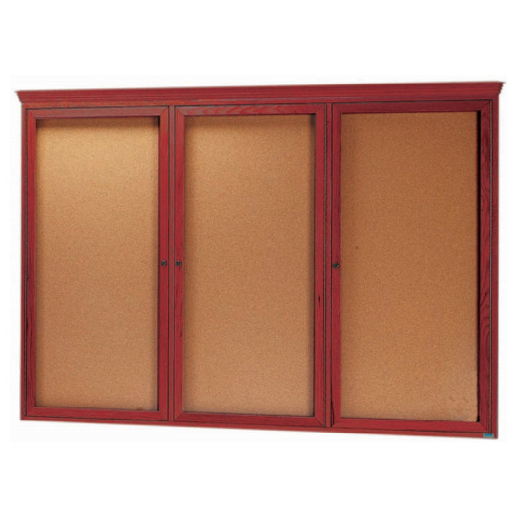 The Aarco CBC4872R Red Oak Bulletin Board is a meticulously crafted enclosed display unit measuring 72"W x 48"H, designed to cater to the needs of both professional and educational settings. Its construction features two doors with precise hairline miters at the corners, ensuring a seamless and sophisticated appearance. The board's back panel is made from natural pebble grain cork, which is ideal for securely pinning announcements, memos, or displays, making it a reliable choice for both office environments and academic institutions. The cherry stained finish adds an elegant touch to its red oak framework, enhancing the aesthetic appeal while maintaining durability. This bulletin board is a superior option for venues looking to combine functionality with a classic design, providing a versatile communication platform that adapts to various organizational needs. Its enclosed design ensures that all content remains protected, making it suitable for high-traffic areas where maintaining presentation quality is essential. The Aarco CBC4872R Red Oak Bulletin Board is an exemplary addition to any space, offering a blend of beauty and practicality with its durable construction and refined finish, meeting the diverse demands of both corporate and educational settings.