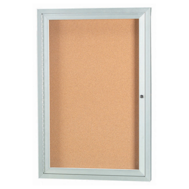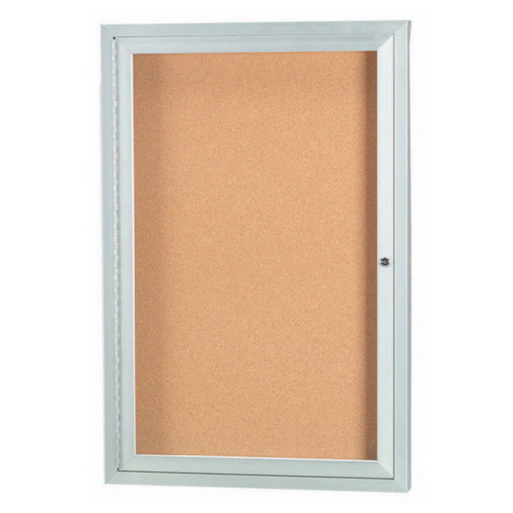 The Aarco DCC3624R Aluminum Bulletin Board 24"W X 36"H Enclosed is a versatile and secure display solution tailored for various professional environments such as educational institutions, corporate offices, and public facilities. This bulletin board features an enclosed design with a single door, ensuring that important notices and information are protected from external elements and tampering. The board's natural pebble grain cork back panel offers a reliable and stylish surface for pinning documents, announcements, and notices, while maintaining an organized appearance. The clear satin anodized finish of the aluminum frame not only enhances its aesthetic appeal but also ensures durability and resistance to wear and tear over time. Measuring 24 inches in width and 36 inches in height, this bulletin board provides ample space for displaying multiple items simultaneously. Its construction highlights a combination of practical functionality and sleek design, making it an indispensable tool for effective communication in any setting. The Aarco DCC3624R bulletin board's enclosed structure and robust features make it a trusted choice for users who require a dependable and visually appealing solution for their bulletin and display needs.