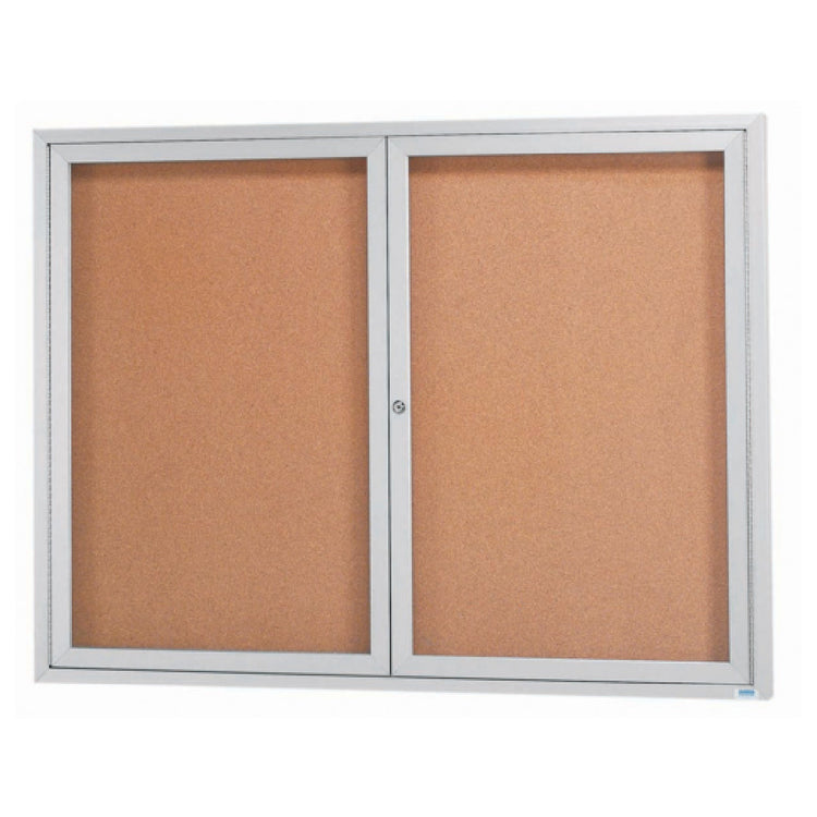 The Aarco DCC4860R Aluminum Bulletin Board 60"W X 48"H Enclosed is a meticulously designed communication tool tailored for a variety of professional environments. This robust bulletin board stands out with its dual-door enclosure, providing a secure and organized space for displaying important information. Its dimensions, 60 inches in width and 48 inches in height, make it suitable for prominent display areas, ensuring messages are visible and accessible. The board features a natural pebble grain cork back panel, which not only enhances the visual appeal but also provides a durable surface for repeated pinning. The clear satin anodized finish of the aluminum frame ensures both aesthetic charm and resistance to wear and tear, making it a long-lasting investment. This bulletin board is particularly valuable for educational institutions, corporate offices, and public service areas, where clear and effective communication is paramount. It balances functionality with style, offering a practical solution for notices and announcements while integrating seamlessly into various decors. The Aarco DCC4860R is designed to meet the needs of diverse market segments seeking reliable and attractive display solutions, highlighting its adaptability and utility in professional settings.