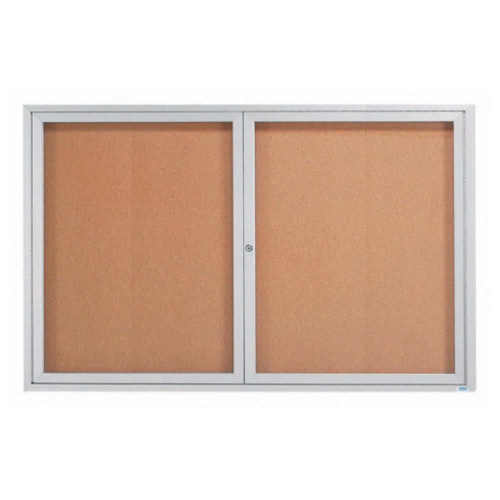 The Aarco DCC4872RI Aluminum Bulletin Board is a high-quality enclosed unit designed to meet diverse communication needs across various industries. Measuring 72 inches in width and 48 inches in height, this bulletin board provides ample space for displaying important information. It features two doors, allowing for easy access and secure closure, making it ideal for environments where information needs to be protected. The board is illuminated, ensuring that displayed content is visible and readable even in low-light conditions. Its natural pebble grain cork back panel provides a durable and receptive surface for posting notices, memos, or announcements. The bulletin board is finished with a clear satin anodized coating, which not only enhances its aesthetic appeal but also protects the aluminum frame from corrosion and wear. This product is versatile, suitable for use in educational institutions, corporate settings, and public spaces where reliable and visible communication is essential. The Aarco DCC4872RI's robust construction and thoughtful design make it a valuable asset for anyone looking to enhance their communication efforts while maintaining a professional appearance.