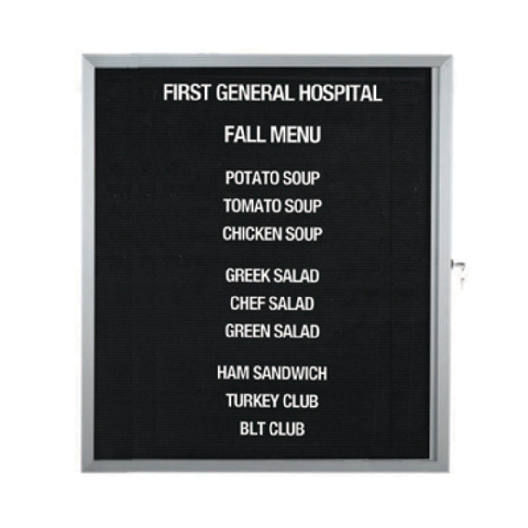 The Aarco EDC3630L Message Center Board 30"W x 36"H Hinged Face is a versatile and secure communication tool, ideal for various professional environments. Featuring a durable aluminum frame and door, this message board is designed to withstand frequent use while maintaining a sleek appearance. The overlapping clam shell design ensures that the board is easy to access and update, while the black felt panel provides a striking backdrop for your messages. The board is equipped with a security lock, guaranteeing that your displayed information remains protected. This model includes a set of 3/4" Helvetica letters and an assortment tray, allowing for clear and customizable message creation. Its aluminum acrylic door enhances visibility and durability, making it suitable for high-traffic areas such as offices, schools, and public buildings. The Aarco EDC3630L Message Center Board is an excellent choice for anyone needing a reliable and professional display solution, combining functionality with a user-friendly design.