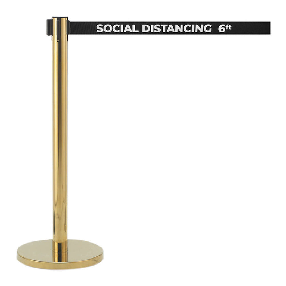 The Aarco HB-7PBK Form-A-Line™ Crowd Control System 40"H Indoor Use is a meticulously designed solution for managing indoor foot traffic while promoting safety. With a height of 40 inches, this crowd control system features a 7-foot retractable double-sided printed black belt, prominently displaying the message "Social Distancing 6ft" to reinforce safety protocols. The belt style is tailored for environments prioritizing health guidelines, making it particularly relevant in venues adapting to new social distancing norms. Its robust 30 lb base ensures stability, even in areas with high foot traffic. Protective rubber floor guards are included to minimize floor damage, preserving the aesthetics of indoor environments. The system boasts a polished brass finish, adding a touch of elegance to its functional design, suitable for upscale venues like hotels, museums, or corporate events. This crowd control system effectively combines safety, functionality, and style, making it a versatile asset for various market segments within industries focused on crowd management and safety. Its technical specifications and durable construction ensure a reliable solution for maintaining order and promoting safe practices in indoor spaces.