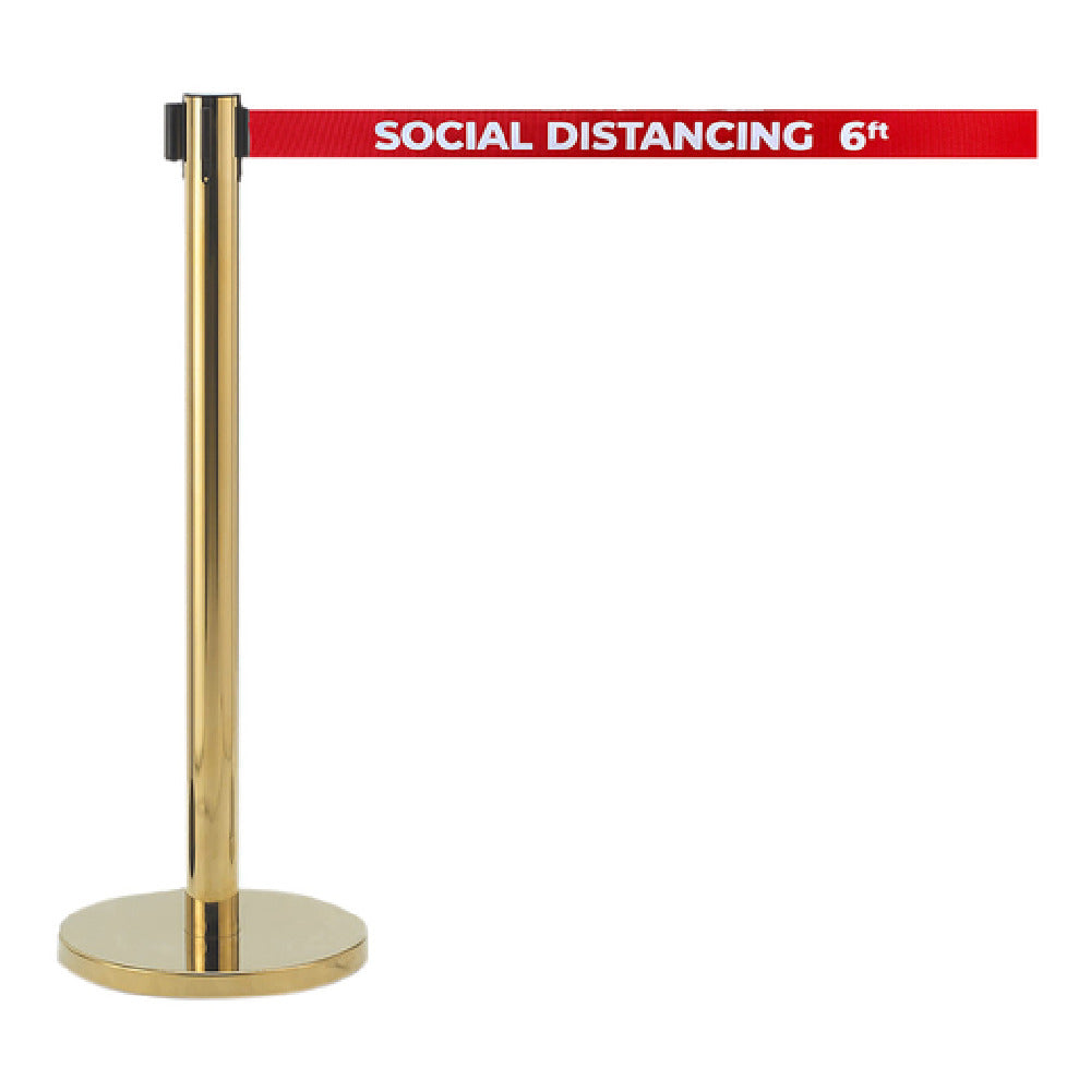 The Aarco HB-7PRD Form-A-Line™ Crowd Control System 40"H Indoor Use is an expertly designed crowd management tool that combines functionality with durability. Standing at 40 inches high, this system is specifically crafted for indoor environments. It features a 7-foot retractable double-sided printed red belt, prominently displaying the message "Social Distancing 6ft," making it ideal for settings that require clear social distancing guidelines. The system is anchored by a sturdy 30 lb base, ensuring stability and minimizing the risk of tipping. To protect flooring surfaces, it includes protective rubber floor guards. The polished brass finish not only adds an elegant aesthetic but also enhances the system’s durability, making it suitable for a variety of professional settings such as banks, airports, retail environments, and event venues. This crowd control system is an essential tool for maintaining order and ensuring the safety and comfort of individuals in any setting where managing foot traffic is crucial.