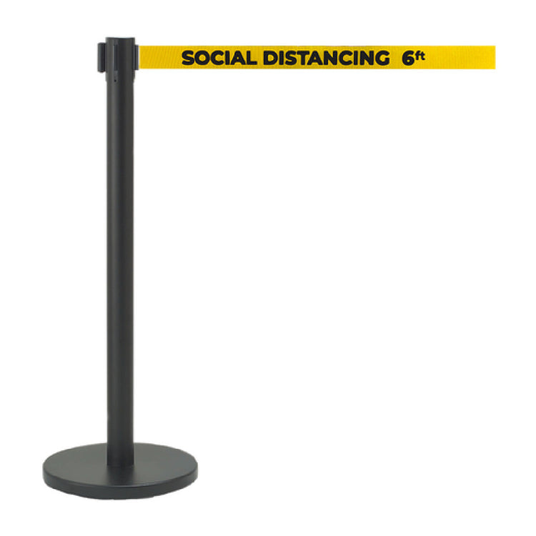 The Aarco HBK-7PYE Form-A-Line™ Crowd Control System is a precision-engineered barrier solution designed for indoor use, standing 40 inches tall. It features a 7-foot retractable double-sided printed yellow belt that prominently displays the message "Social Distancing 6ft," making it highly relevant for spaces emphasizing health protocols. The belt’s vibrant yellow color ensures visibility, while the durable 30 lb base provides stability, enhanced by protective rubber floor guards that prevent surface damage. Its black powder-coated finish adds a sleek, professional appearance, suitable for diverse indoor environments such as retail spaces, airports, and event venues where efficient crowd management is crucial. This system is adept at clearly defining spaces and guiding foot traffic, making it indispensable for businesses aiming to maintain order and safety. The Aarco HBK-7PYE’s blend of functionality and design makes it a versatile tool for sectors needing reliable crowd control measures, from hospitality and transportation to educational institutions. Its robust construction guarantees longevity and consistent performance, offering a reliable solution for managing pedestrian flow effectively in any setting.
