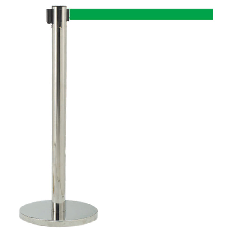 The Aarco HC-10GR HC-10GR Form-A-Line™ System Retractable Belt Style has a Chrome Finish is a sophisticated solution designed for effective crowd management in various settings, including airports, banks, and event venues. Featuring a polished chrome finish, this system not only adds aesthetic appeal but also boasts durability and longevity. The green retractable belt integrates seamlessly with the system, providing a clear yet non-intrusive means of directing foot traffic. Standing at a height of 40 inches, it ensures visibility, while the sturdy 30-pound base offers stability even in high-traffic areas. Equipped with protective rubber floor guards, the system minimizes floor damage and slippage, ensuring safety and preserving floor quality. The Aarco HC-10GR is engineered to be both functional and visually appealing, making it a versatile choice for industries that prioritize crowd control and organizational efficiency. Its meticulous design highlights both form and function, catering to a variety of market segments looking for reliability and style in their public space management tools.