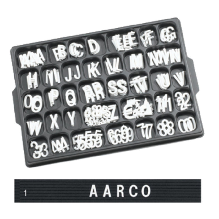 The Aarco HFD1.0 Letter Set 1"H Helvetica Typeface is a meticulously crafted collection of characters, designed to meet the versatile needs of various professional settings. With a total of 330 characters, this product stands out in its category for providing a comprehensive assortment of letters, numbers, and symbols. Each character is precisely injection molded, ensuring uniformity and durability, which is crucial for maintaining visual consistency in presentations or signage. The Helvetica typeface, renowned for its clean and modern aesthetic, adds a touch of professionalism and clarity to any display. This letter set features a universal single tab design, making it compatible with a wide range of substrates and surfaces, enhancing its usability in diverse environments such as educational institutions, corporate offices, and retail spaces. Additionally, the set includes an assortment tray with identification symbols, facilitating easy organization and quick access to the right characters when needed. The crisp white color of the characters ensures high visibility and legibility, even from a distance, making it ideal for both indoor and outdoor applications. The Aarco HFD1.0 Letter Set is a reliable choice for those seeking a balance of quality, functionality, and style in their signage solutions.