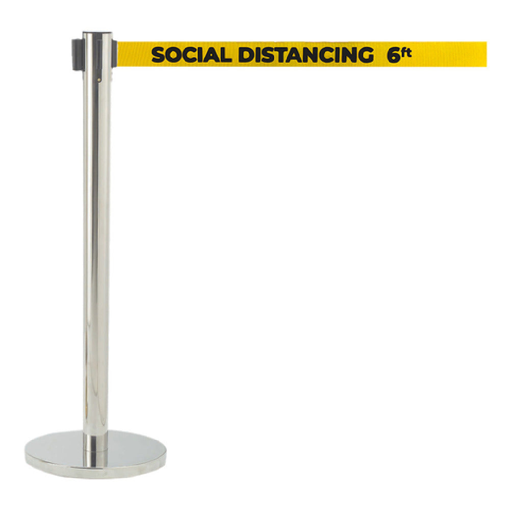 The Aarco HS-7PYE Form-A-Line™ Crowd Control System 40"H Indoor Use is a meticulously designed solution catering to diverse industry needs for effective and adaptable crowd management. Standing at a height of 40 inches, this system is specifically crafted for indoor use, ensuring a streamlined approach to maintaining order and guiding foot traffic in various settings. The 7-foot retractable belt is double-sided and features a high-visibility yellow color emblazoned with "Social Distancing 6ft," a vital feature for public spaces striving to uphold health guidelines. Weighing in at 30 pounds, the robust base provides stability while its protective rubber floor guards preserve flooring integrity. The system's satin chrome finish adds an aesthetic appeal, making it a fitting addition to environments that value both functionality and design. This crowd control system is ideal for use in retail environments, airports, event venues, and corporate offices where managing the flow of people efficiently is crucial. By integrating technical precision and practical design elements, the Aarco HS-7PYE ensures a superior crowd management experience, underlining its indispensability across various professional domains.