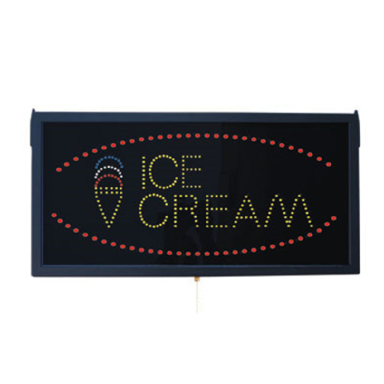 The Aarco ICE13L LED Sign - 23-1/2"W x 11-3/4"H - "ICE CREAM" is a versatile signage solution that caters to a variety of business environments looking to attract customers with vibrant visual displays. This LED sign measures 23-1/2 inches in width and 11-3/4 inches in height, making it a suitable size for both small and large storefronts, maximizing visibility without overwhelming the space. The sign is equipped with three distinct display modes: steady, flashing, and crawling, providing flexibility in presentation to suit different promotional needs or aesthetic preferences. This feature allows businesses to easily customize their messaging to capture attention and increase foot traffic. Additionally, the Aarco ICE13L LED Sign is designed with energy efficiency in mind, offering businesses a cost-effective advertising tool that minimizes power consumption while maintaining bright, eye-catching illumination. This LED sign is particularly valuable for ice cream shops, cafes, event venues, and any retail space where drawing attention to ice cream offerings is beneficial. Its technical attributes, combined with its efficient energy use, provide a reliable and engaging way to enhance customer engagement and support business growth.