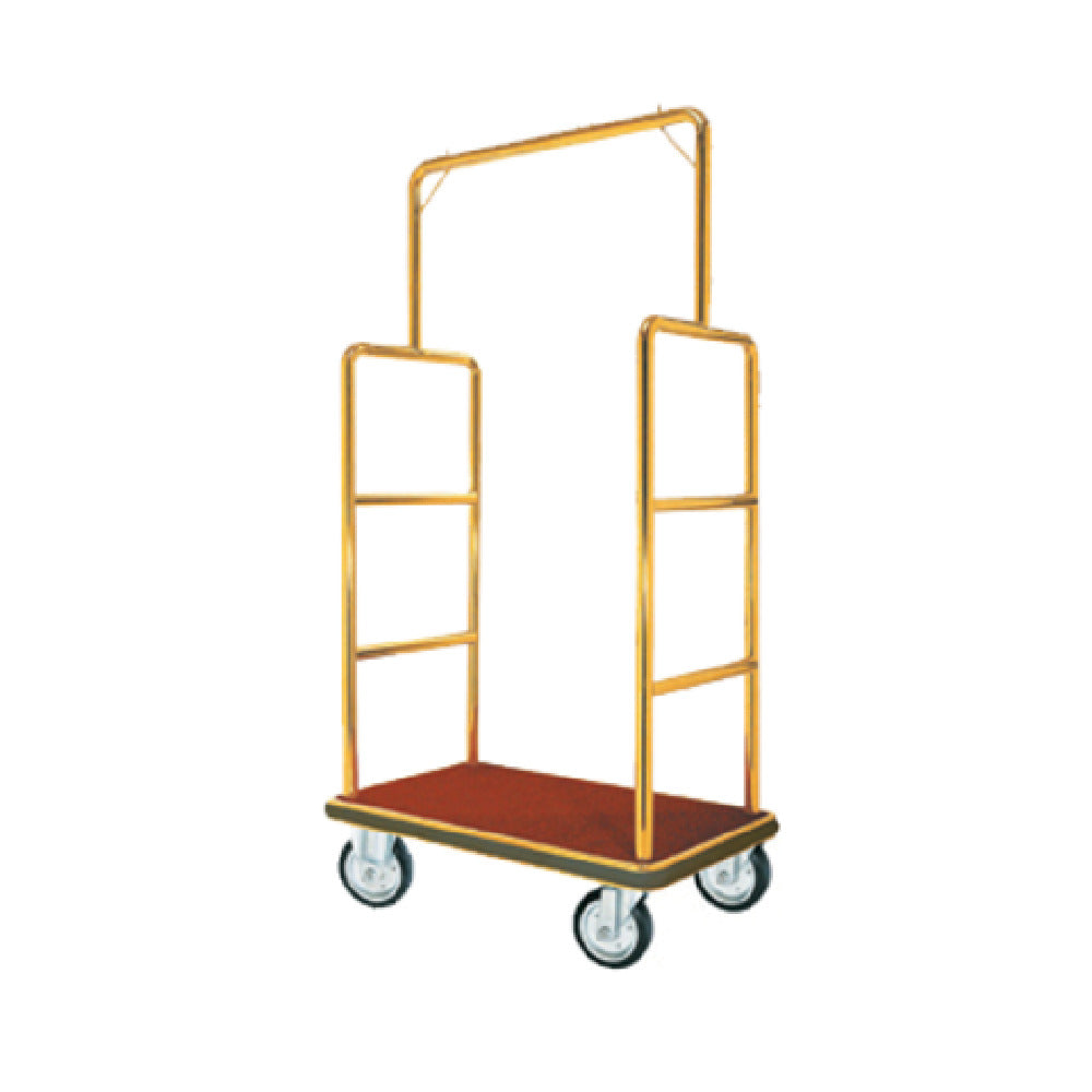 The Aarco LC-1B Luggage Cart is a robust and versatile solution designed to meet the demands of various segments within the hospitality and transportation industries. Measuring 24"W x 42"L x 72"H, this luggage cart features a 1-1/2" diameter tubular brass frame, offering both durability and a classic aesthetic appeal. The structure is complemented by three horizontal side bars, which provide added security for luggage while in transit. Its red carpet bed not only enhances the cart's elegant appearance but also offers a soft, protective surface for delicate items. The addition of bumper guards ensures that both the cart and surrounding environments are shielded from damage during use. Equipped with 6" solid wheels, the Aarco LC-1B is engineered for smooth maneuverability, suitable for both indoor and outdoor operations. This luggage cart is an essential asset for hotels, resorts, and transport hubs, providing reliable and efficient luggage handling with a focus on quality and performance. Its sturdy construction and practical design make it a valuable tool for enhancing guest satisfaction and operational efficiency in various commercial settings.
