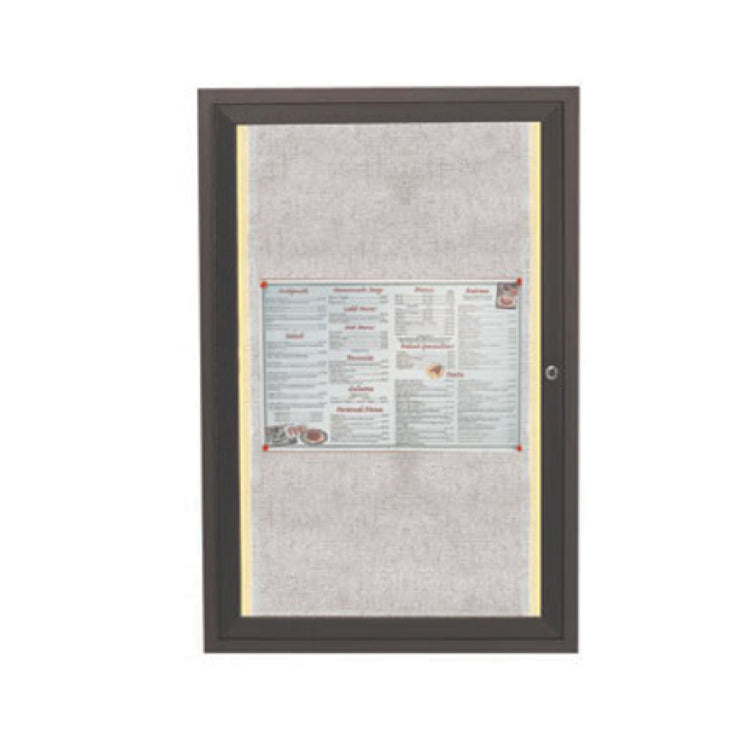 The Aarco LODCC2418RBA Bulletin Board is a versatile enclosed unit designed for both indoor and outdoor use, measuring 18 inches in width and 24 inches in height. It features a burlap weave vinyl surface, complemented by a durable aluminum frame with a bronze finish for aesthetic appeal. The board is equipped with an LED lighting system to enhance visibility and presentation of displayed materials. Its construction includes an acrylic safety glass window for a clear view, with a lockable single door that is mounted on a continuous hinge for smooth operation and long-term durability. The unit is built with mitered corners and a thick rubber door seal for enhanced protection against the elements. Its weatherized rear surface and vented design ensure it is suitable for various environmental conditions. Additionally, the bulletin board incorporates a concealed mounting bracket for secure installation and a power cord for the LED lights. This product is ideal for educational institutions, corporate environments, and community centers looking to securely display important information while maintaining an elegant and professional appearance. The combination of practical features and robust construction makes it a reliable choice for diverse applications in different market segments.