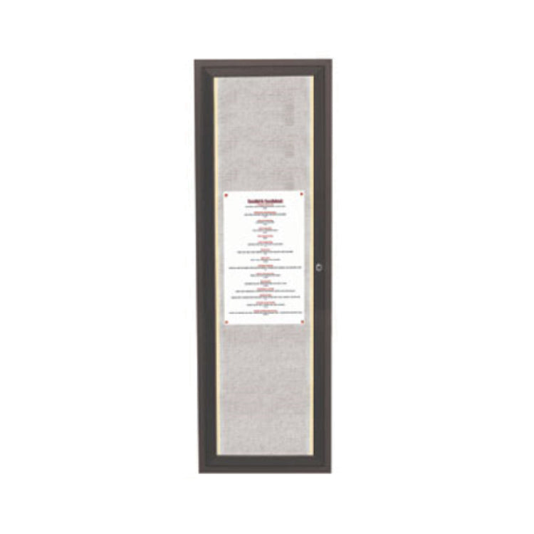 The Aarco LODCC3612RBA Bulletin Board is a versatile enclosed display solution measuring 12 inches in width and 36 inches in height, ideal for both indoor and outdoor use. Its burlap weave vinyl surface is encased in a durable aluminum frame, providing a sophisticated bronze finish that enhances any environment. This bulletin board is equipped with LED lights, ensuring visibility in various lighting conditions. The acrylic safety glass window offers a clear view while safeguarding the contents. With a single lockable door secured by a continuous hinge and mitered corners, it ensures durability and security. The vented, weatherized rear surface and thick rubber door seal protect against the elements, making it suitable for diverse weather conditions. A concealed mounting bracket adds to its seamless installation, while the included power cord ensures easy connectivity. Designed with both security and practicality in mind, this bulletin board caters to educational institutions, corporate offices, and community centers, providing a reliable platform for displaying important information. Its blend of robust construction and elegant design makes it an invaluable asset for varied industry segments seeking a dependable and aesthetically pleasing communication tool.
