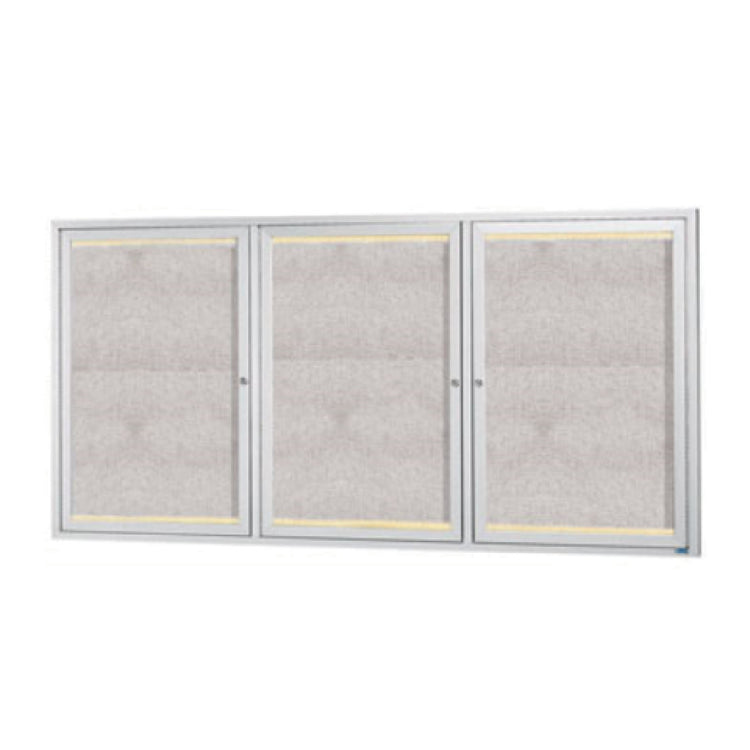 The Aarco LODCC3672-3R Bulletin Board is an advanced display solution, measuring 72 inches in width and 36 inches in height, designed to cater to various professional environments. Its enclosed structure is built with a durable burlap weave vinyl surface, providing both aesthetic appeal and practical functionality. Encased in a sturdy aluminum frame with a clear satin anodized finish, this bulletin board is equipped with LED lights, enhancing visibility of the displayed content. The board features an acrylic safety glass window and three lockable doors, each fitted with a continuous hinge for secure, smooth operation. This product is particularly valuable for settings that require a high level of security and protection from the elements, thanks to its vented and weatherized rear surface and thick rubber door seal. The concealed mounting bracket and included power cord facilitate easy and efficient installation for both indoor and outdoor use. The mitered corners add a polished look while ensuring structural integrity. The Aarco LODCC3672-3R caters to educational institutions, corporate offices, and public spaces, offering a reliable and versatile medium for communication and display needs.
