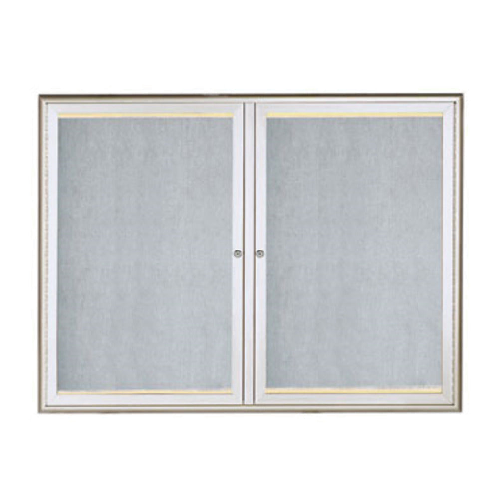 The Aarco LOWFC3648 Waterfall Bulletin Board is an enclosed unit measuring 48 inches in width and 36 inches in height, crafted to meet the needs of various professional environments. It features a contemporary design with a burlap weave vinyl surface that adds a subtle texture, making it suitable for both indoor and outdoor use. The bulletin board is framed with durable aluminum and accented with clear anodized finish, ensuring longevity and a sleek, modern appearance. The clear acrylic safety glass provides visibility while protecting contents, and the full-length hinges enable smooth operation of the lockable doors, enhancing security for displayed materials. The inclusion of LED lighting and a power cord ensures optimal visibility of information, even in dimly lit settings. Additionally, the concealed mounting brackets allow for seamless installation, preserving the board's aesthetic appeal. This bulletin board is ideal for corporate offices, educational institutions, and public spaces, where a reliable and visually appealing medium for communication is essential. The Aarco LOWFC3648 is a versatile and secure solution for displaying important notices, announcements, and other visual content, offering both functionality and style in its design.