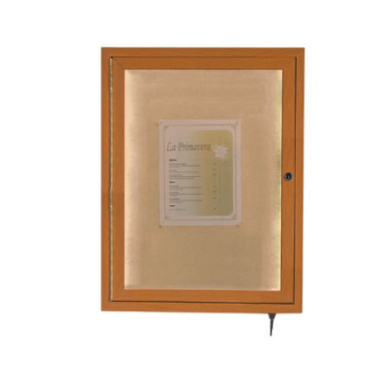 The Aarco LWL2418O Display Case 18"W X 24"H Enclosed is a versatile showcase solution, engineered for both indoor and outdoor applications. This display case features an 18-inch width and 24-inch height, offering ample space for presenting valuable items. The enclosed design incorporates a burlap weave vinyl surface and a wood-like aluminum frame, combining durability with a stylish oak finish. One of its standout features is the acrylic safety glass window, which ensures both visibility and protection of the contents. The single door is lockable and equipped with a continuous hinge, providing secure access. The case is weatherized with a vented real surface and a thick rubber door seal, perfect for varying environmental conditions. Integrated LED lights enhance the display, making it suitable for a wide range of professional settings. The concealed mounting bracket and included power cord provide seamless installation and operation. This display case is a reliable choice for businesses seeking to present products or information efficiently in a secure and visually appealing manner.