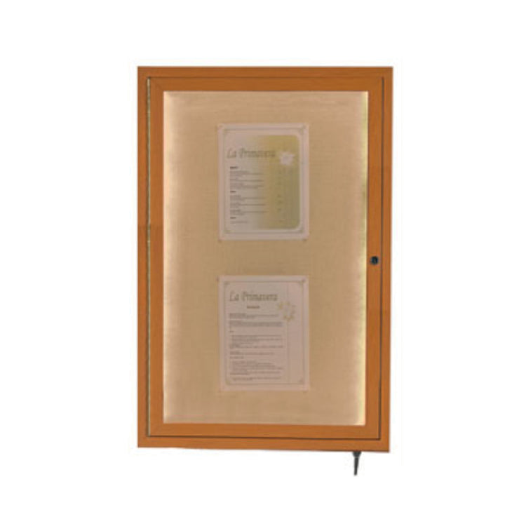 The Aarco LWL3624O Display Case is a 24-inch wide by 36-inch high enclosed unit designed for both indoor and outdoor use, offering a versatile solution for displaying valuable items securely. Its burlap weave vinyl surface and wood-like aluminum frame provide an aesthetically pleasing appearance that enhances any environment. The display case is equipped with LED lights, ensuring excellent visibility of contents at all times. A single, lockable door with acrylic safety glass windows is featured, providing secure access while protecting displayed items. The door is supported by a continuous hinge and features a thick rubber door seal, enhancing its weatherized capability. Additionally, the vented design allows for optimal air circulation, preserving the quality of the displayed items. The case includes a concealed mounting bracket, facilitating easy installation and a seamless look. Finished in oak, it integrates seamlessly with a variety of decors. The display case is equipped with a power cord, ensuring straightforward connectivity. This sophisticated and functional display solution meets the needs of different segment markets, from retail displays to educational and institutional environments, by combining durability and elegance with practical features for diverse applications.