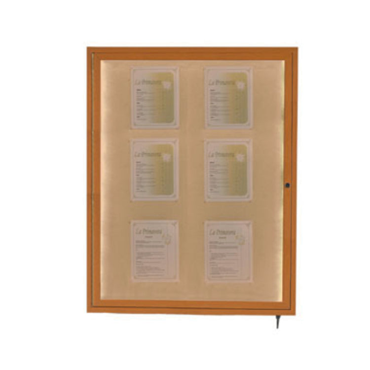The Aarco LWL4836O Display Case 36"W X 48"H Enclosed is an elegantly designed showcase ideal for both indoor and outdoor settings, offering a sophisticated display solution for a variety of industries. Constructed with a wood-like aluminum frame finished in oak, this display case combines aesthetic appeal with durability. It features a burlap weave vinyl surface that adds a textured and refined backdrop for showcased items. The enclosure is equipped with LED lights, ensuring optimal illumination for the displayed contents. Safety and security are prioritized with an acrylic safety glass window and a lockable single door, supported by a continuous hinge for smooth operation. The case is built to withstand diverse environments with a vented, weatherized real surface and a thick rubber door seal, which safeguards against the elements. Additionally, the display case is designed with a concealed mounting bracket and a power cord for easy installation and connectivity. This versatile and reliable display case is perfect for businesses requiring a secure and attractive display option that emphasizes both functionality and style.