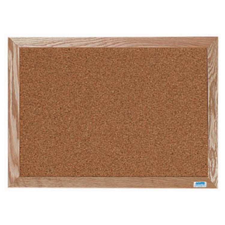 The Aarco OB1824 Bulletin Board is a compact and versatile display solution, measuring 24 inches in width by 18 inches in height, ideal for both personal and professional settings. This bulletin board features a natural pebble grain cork surface, providing a reliable and durable posting area for notes, messages, and important information. The cork's unique texture not only enhances the aesthetic appeal but also ensures that pins and tacks are held securely in place. Encased in a stylish red oak frame, the bulletin board is finished with a clear lacquer, which adds a layer of protection while accentuating the natural beauty of the wood. This bulletin board's combination of high-quality materials and thoughtful design makes it an excellent choice for schools, offices, and homes where organization and communication are key. Its size allows for strategic placement in smaller spaces, while the natural cork surface offers an eco-friendly and self-healing option for frequent use. The Aarco OB1824 Bulletin Board is an outstanding tool for enhancing productivity and creativity, serving as a central hub for collaboration in various environments.