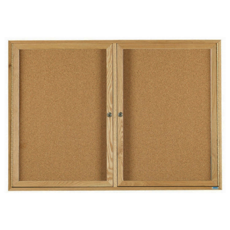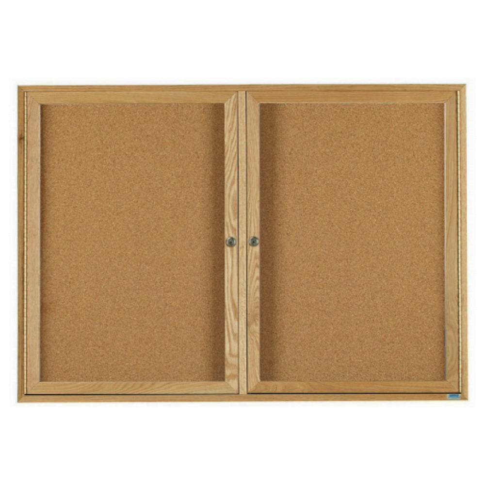 The Aarco OBC3660R Red Oak Bulletin Board is a premium enclosed message center designed for various professional settings, measuring 60 inches in width and 36 inches in height. This bulletin board features dual doors, providing easy access while maintaining the pristine presentation of enclosed materials. The meticulous construction of the board is evident in its hairline miters at corners, ensuring a seamless and elegant finish. Within the enclosure, a natural pebble grain cork back panel supports efficient pinning and offers a visually appealing backdrop for displayed items. Adding to its aesthetic appeal, the board is adorned with a high gloss clear lacquer finish, enhancing the natural beauty of the red oak frame while providing durability. This product is suitable for educational institutions, corporate environments, and community centers seeking a reliable and stylish means of communication. Its robust build and sophisticated design make it a versatile solution for displaying essential information or creative displays, ensuring that communications are both visible and secure. The Aarco OBC3660R Red Oak Bulletin Board combines functionality with elegance, catering to a range of professional display needs.