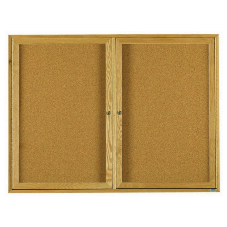 The Aarco OBC4872R Red Oak Bulletin Board is an expertly crafted display solution, measuring a substantial 72 inches in width and 48 inches in height, tailored for both professional and educational settings. This enclosed bulletin board features two doors, providing secure access to its contents while maintaining a polished appearance. Its design is characterized by hairline miters at the corners, adding an elegant touch to its robust construction. The back panel is made from natural pebble grain cork, offering a durable surface for pinning documents, notices, and announcements. The high gloss clear lacquer finish not only enhances the aesthetic appeal of the red oak frame but also ensures long-lasting protection against wear and tear. This bulletin board is ideal for environments where information needs to be displayed prominently and securely, such as offices, schools, and community centers. Its size and enclosed design make it suitable for high-traffic areas, where maintaining the integrity of the displayed content is paramount. The Aarco OBC4872R combines functionality with style, making it a valuable addition to any setting that requires a reliable and attractive display solution.