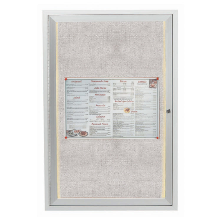The Aarco ODCC2418RI Aluminum Bulletin Board is a meticulously crafted display solution designed for outdoor use, measuring 18 inches in width and 24 inches in height. This enclosed bulletin board features a single door, providing secure access to displayed content, and is illuminated to ensure visibility in various lighting conditions. The back panel is constructed with a unique burlap weave vinyl, offering a textured surface that enhances the presentation of posted materials. The board's frame boasts a clear satin anodized finish, which not only provides a sleek, professional appearance but also ensures durability against the elements. This product is particularly suited for environments where communication and information dissemination are critical, such as educational institutions, corporate offices, and community centers. Its robust aluminum construction makes it a reliable choice for both commercial and public settings, ensuring long-lasting performance. The Aarco ODCC2418RI combines aesthetic appeal with functional design, making it an essential tool for effective communication in outdoor scenarios.