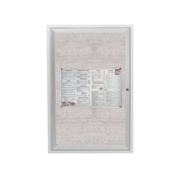 The Aarco ODCC3624R Bulletin Board 24"W X 36"H Enclosed is a meticulously engineered display solution, ideal for both indoor and outdoor use, boasting a burlap weave vinyl surface for a professional aesthetic. The board's enclosed design features an aluminum frame and an acrylic safety glass window, ensuring durability and visibility. This model includes a single lockable door with a continuous hinge, providing secure access and ease of use. Mitered corners add a touch of elegance while the vented and weatherized rear surface, complemented by a thick rubber door seal, offers enhanced protection against the elements. The concealed mounting bracket facilitates seamless installation, preserving the board's sleek appearance. Its clear satin anodized finish not only enhances the board's visual appeal but also provides an extra layer of resistance against wear and tear. The Aarco ODCC3624R Bulletin Board's robust construction and distinctive features make it a versatile choice for educational institutions, corporate offices, and community centers, where reliable information display is paramount. Its capacity to withstand various environmental conditions without compromising on accessibility or security underscores its value as a long-term investment for organizations seeking both functionality and style.