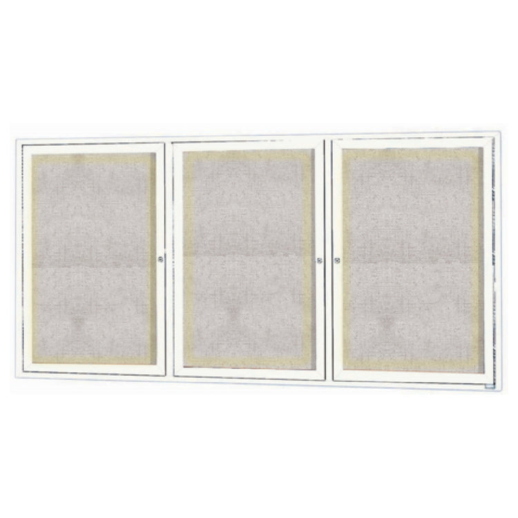 The Aarco ODCC3672-3RI Aluminum Bulletin Board is a versatile display solution tailored for professional environments that require both functionality and durability. Measuring 72 inches in width and 36 inches in height, this enclosed bulletin board is designed to serve diverse markets, including educational institutions, corporate offices, and public facilities. It features three doors, each equipped with clear satin anodized aluminum frames, ensuring easy access while maintaining a sleek, professional appearance. The board's burlap weave vinyl back panel adds an aesthetic touch, offering an attractive backdrop for posted materials. Engineered for outdoor use, the enclosure provides protection against the elements, making it suitable for external installations. Additionally, the board is illuminated, enhancing visibility of displayed content in low-light conditions, thereby increasing its utility in various settings. The Aarco ODCC3672-3RI's blend of robust construction and elegant design makes it a valuable choice for those seeking a reliable and stylish bulletin board solution. Its technical specifications are tailored to meet the needs of users who prioritize both aesthetics and functionality in their display solutions.