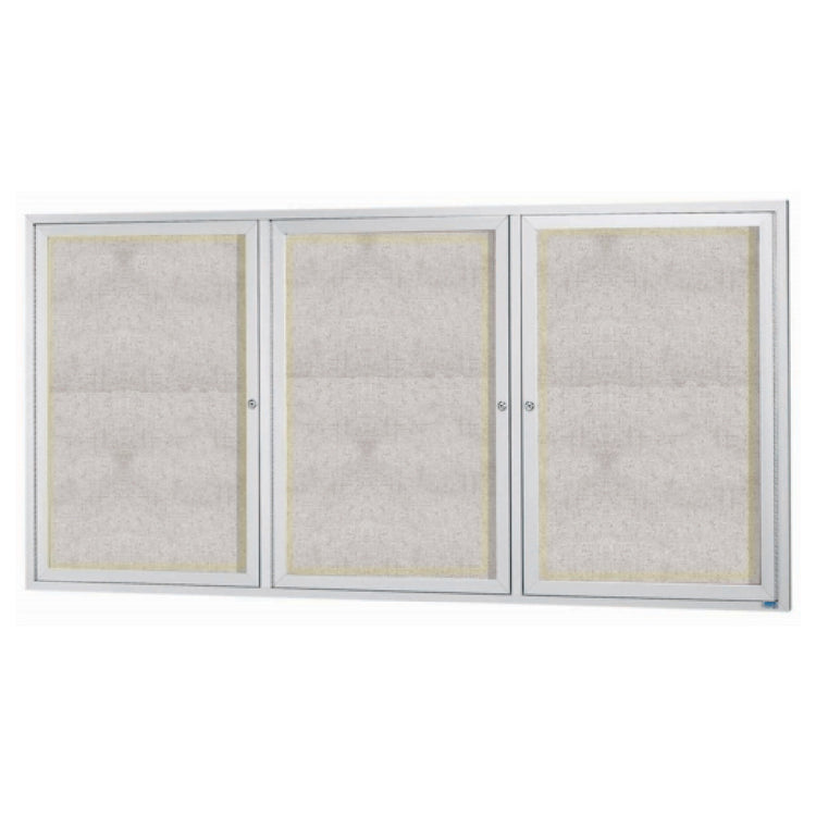 The Aarco ODCC4896-3RI Aluminum Bulletin Board is an exceptional enclosed display solution, measuring 96 inches in width and 48 inches in height. It features a durable aluminum construction that is enhanced by a clear satin anodized finish, making it suitable for outdoor use. This bulletin board is equipped with three doors, providing ample access for displaying important information in a secure manner. Each door is illuminated, ensuring visibility even in low light conditions, which is particularly beneficial for outdoor settings. The burlap weave vinyl back panel not only adds a touch of elegance but also enhances the durability and longevity of the display surface. This bulletin board is ideal for educational institutions, corporate environments, and community centers where communication and information dissemination are crucial. Its robust construction and design make it a reliable choice for showcasing announcements, notices, or educational content in various settings. The Aarco ODCC4896-3RI stands out as a versatile and practical solution for any organization looking to combine functionality with aesthetic appeal, making it a valuable addition to any professional or public space.