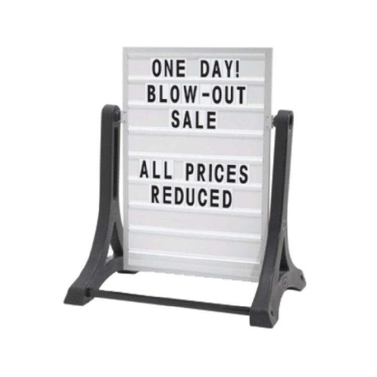 Aarco ROC-1 The Rocker™ Sidewalk Sign is a versatile signage solution measuring 36 inches in height and 24 inches in width for the board only, with an overall dimension of 32 inches in length, 22 inches in width, and 42 inches in height. This double-sided sidewalk sign features a high-contrast, changeable letter board that accommodates up to seven lines of text, providing ample space for clear and effective messaging. The deluxe satin anodized aluminum frame not only enhances aesthetic appeal but also ensures durability and weather resistance, making it suitable for outdoor use. A unique feature of this sign is its ability to rock with wind, which can draw additional attention to the displayed message. This product includes a comprehensive set of 354 characters, each 4 inches in size, enabling customizable communication. While assembly is required, the sign is designed to be straightforward to set up. Ideal for retail businesses, restaurants, and event venues looking to maintain dynamic and visible announcements, the Aarco ROC-1 The Rocker™ Sidewalk Sign combines functionality with practical design, making it a valuable tool for enhancing customer engagement and promoting messages effectively in various settings.