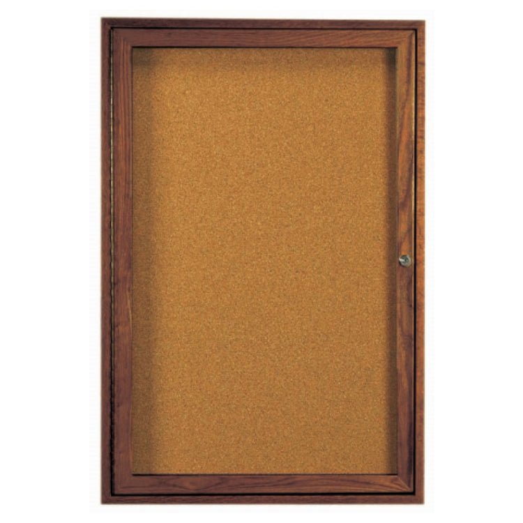 The Aarco WBC3624R Red Oak Bulletin Board 24"W x 36"H Enclosed is a meticulously crafted display solution designed to meet the needs of both professional and personal environments. Featuring an enclosed design with a single door, this bulletin board ensures the security of displayed materials while maintaining easy access for updates and changes. The board is constructed with precision, incorporating hairline miters at the corners for a sleek and seamless appearance. The natural pebble grain cork back panel provides a durable and receptive surface for pinning notices, memos, or important documents. The bulletin board's red oak construction is finished with a walnut stain, offering an elegant and professional aesthetic suitable for any setting. Measuring 24 inches in width and 36 inches in height, it provides ample space for a variety of display purposes, making it an ideal choice for educational institutions, corporate offices, and personal use. The Aarco WBC3624R stands out for its combination of functionality and style, making it a versatile addition to any environment where information display is essential. Its craftsmanship and materials reflect a commitment to quality and longevity, ensuring it remains a reliable fixture for years to come.