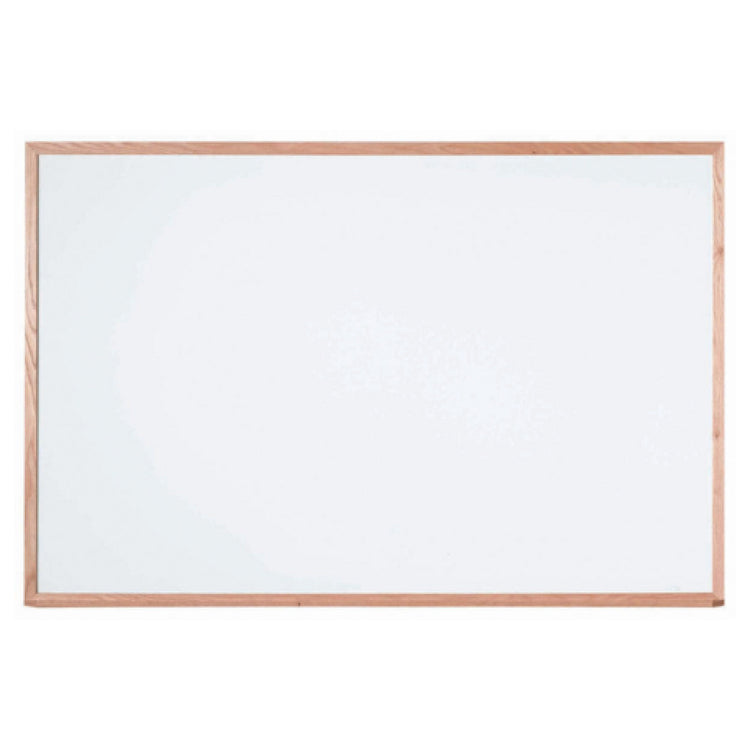 The Aarco WOS4872 White Porcelain Markerboard Wall Mount - 72"W x 48"H is a premium writing surface designed for professional and educational environments. This product features a high-quality white porcelain surface that provides a smooth and durable writing experience, ensuring longevity and ease of maintenance. The markerboard is encased in a sturdy red oak frame, adding an element of elegance and strength to the overall design. The steel back enhances the board's durability and stability when mounted on the wall, making it a reliable choice for high-traffic areas. With dimensions of 72 inches in width and 48 inches in height, this markerboard offers generous space for presentations, brainstorming sessions, or classroom instructions. Ideal for corporate offices, educational institutions, and training facilities, the Aarco WOS4872 is engineered to support a variety of communicative and collaborative activities. Its robust construction and ample writing space make it a versatile tool for professionals seeking a dependable solution for their interactive display needs. The combination of high-quality materials and thoughtful design ensures that this markerboard not only performs effectively but also complements the aesthetic of any room where it's installed.