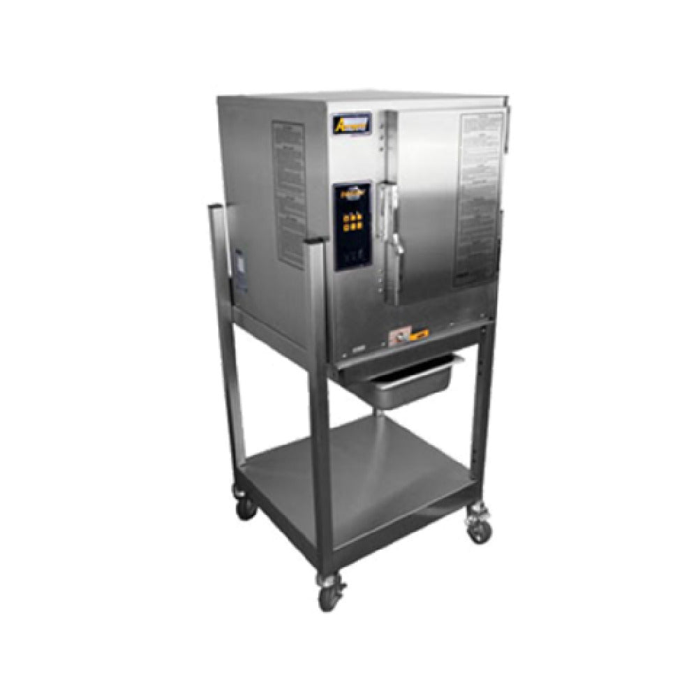 The AccuTemp P61201D060 SGL Connectionless Evolution™ Boilerless Convection Steamer with Steam Vector Technology is a cutting-edge culinary tool engineered for professional food service environments. This LP gas-powered steamer boasts a capacity of (6) 12"x 20"x 2-1/2" deep pans, making it ideal for high-volume cooking applications. It features innovative Steam Vector Technology, allowing for consistent and efficient steam distribution without the need for a water or drain connection, which simplifies installation and maintenance. The unit's digital controls provide precision and ease of use, ensuring that cooking processes are consistently reliable. With a powerful 60,000 BTU output, it is designed to meet the demands of busy kitchens. The steamer's operation is not hindered by water quality issues, and it does not require a water filtration system, presenting a significant advantage in terms of reduced operational costs and maintenance. The 120/60/1 phase electrical system comes with a NEMA 5-15P cord, ensuring compatibility with standard power outlets. Furthermore, the steamer is ENERGY STAR® certified, underscoring its energy efficiency. This model includes a stand configured to your choice, providing flexibility in kitchen layout and integration.