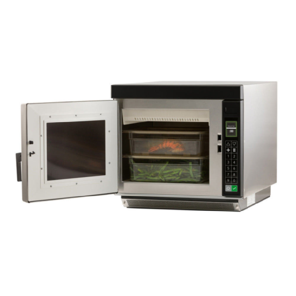 The Amana RC17S2 Amana® Commercial Microwave Oven 1.0 Cu. Ft. 1700 Watts is a powerful appliance engineered for heavy-volume applications, catering to diverse commercial needs. With a robust 1700 watts of power and a spacious 1.0 cubic foot interior, it accommodates a wide range of cooking tasks. Equipped with four-stage cooking and 11 power levels, this microwave ensures precision and flexibility in cooking. It features 100 memory settings and a maximum cooking time of 60 minutes, allowing for custom programming of frequently used procedures. Designed with an LCD display and touch controls, the unit is also ADA-compliant with Braille touch pads, ensuring accessibility for all users. The audible end-of-cycle signal alerts staff upon completion of programmed tasks. The side-hinged door incorporates tempered glass, while the LED lighted interior enhances visibility of cooking progress. A USB port facilitates easy updates, and the sealed, recessed ceramic shelf complements the durable stainless steel exterior and interior, ensuring longevity and easy cleaning. Operating at 208-240v/60/1-ph with a total power draw of 2700 watts and a NEMA 6-20P plug, it meets ETL, ETL-Sanitation, cETLus, NSF, CSA, FDA, CE, and UL standards, making it a reliable choice for any commercial kitchen.