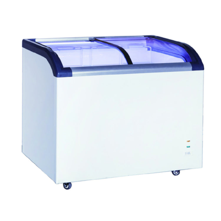 The Admiral Craft BDCF-9-CG Black Diamond Chest Freezer stands out with its substantial capacity of 9.6 cubic feet, making it a versatile asset for commercial kitchens, convenience stores, and food service establishments. With overall dimensions of 40-1/2 inches in width, 26-4/5 inches in depth, and 33-1/2 inches in height, it integrates seamlessly into diverse spaces. The curved sliding glass lid not only enhances visibility but also aids in energy efficiency. The freezer includes three wire-coated baskets for organized storage, complemented by LED interior lighting that ensures optimal visibility. Manual temperature control and defrost options allow for precise management within a temperature range of -4°F to -10°F. The indicator lights provide intuitive feedback. The unit also features a drain plug for effortless maintenance. Its bottom-mounted self-contained refrigeration system utilizes eco-friendly R290 Hydrocarbon refrigerant, operating efficiently on a 115v/60/1-ph electrical setup with a 1.6 amp draw. The 8-foot power cord, equipped with a NEMA 5-15P plug, ensures adaptability across various settings. The white aluminum interior and white powder-coated steel exterior offer durability, while the unit’s mobility is enhanced by four built-in casters. Certified by cETLus and ETL-Sanitation, this freezer upholds stringent safety and sanitation standards.